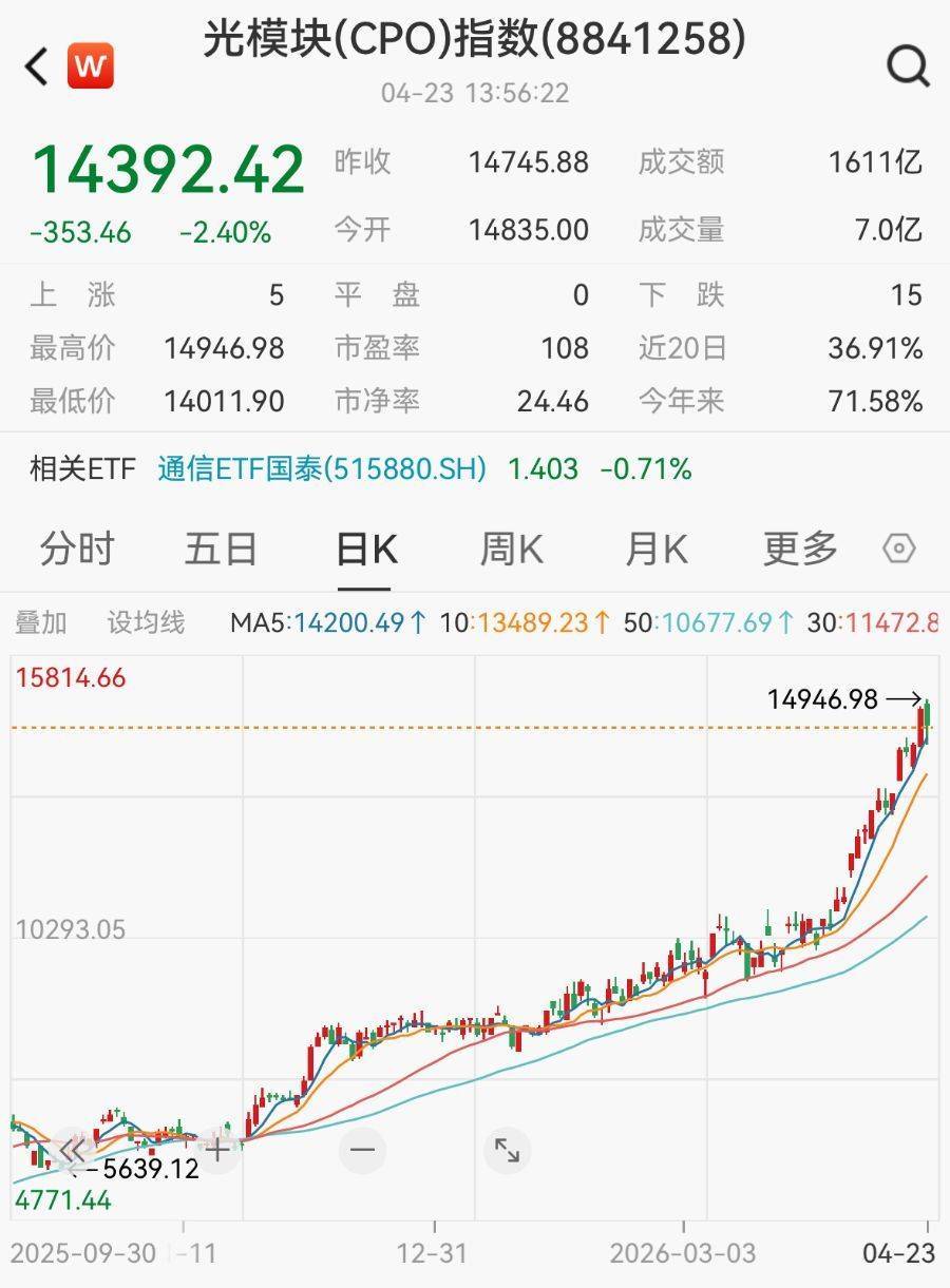 谣言传播背后或与光模块连日来的狂飙行情有关。Wind数据显示,截至4月23日13:56,年内光模块(CPO)指数已涨超70%,其中月内涨幅超40%。