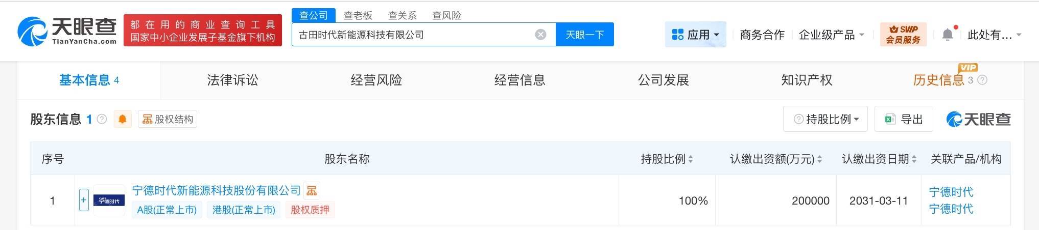 南方财经4月23日电,天眼查App显示,近日,古田时代新能源科技有限公司成立配资手机平台,法定代表人为曲涛,注册资本20亿人民币,经营范围为电池制造,电池销售,电子专用材料制造,电子专用材料销售,新材料技术推广服务,技术服务、技术开发、技术咨询、技术交流、技术转让、技术推广,货物进出口。股东信息显示,该公司由宁德时代(300750)全资持股。