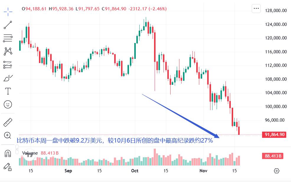 比特币最大财库公司Strategy周一披露,在截至上周日的七天内买入8.356亿美元比特币,创去年7月以来最大单周买入规模。但这一抄底目前并未提振市场情绪。比特币周一美股盘中跌破9.2万美元,抹平今年内涨幅,较10月6日所创的盘中最高纪录跌约27%。